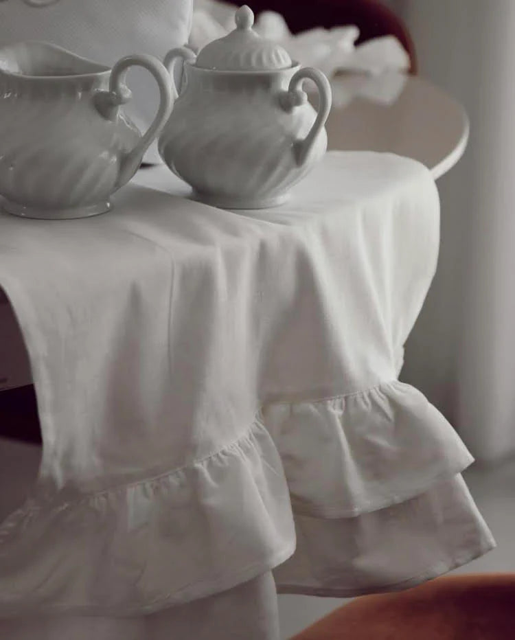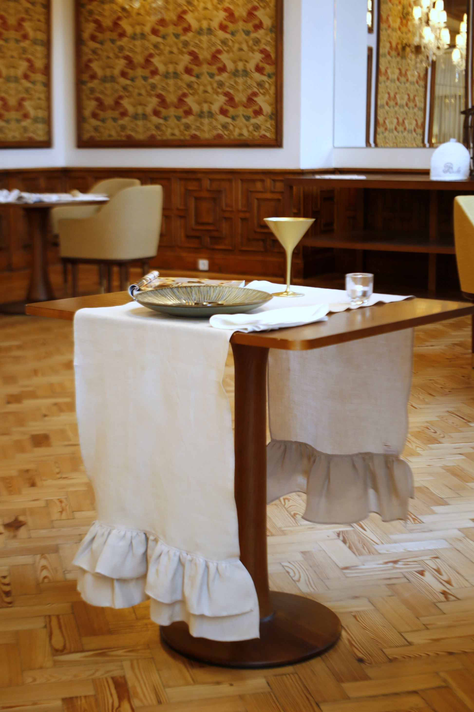 Destaque a mesa com o caminho em linho certificado com dois folhos, combinando volume e sofisticação. Ideal para criar um ponto focal requintado em jantares íntimos ou celebrações.