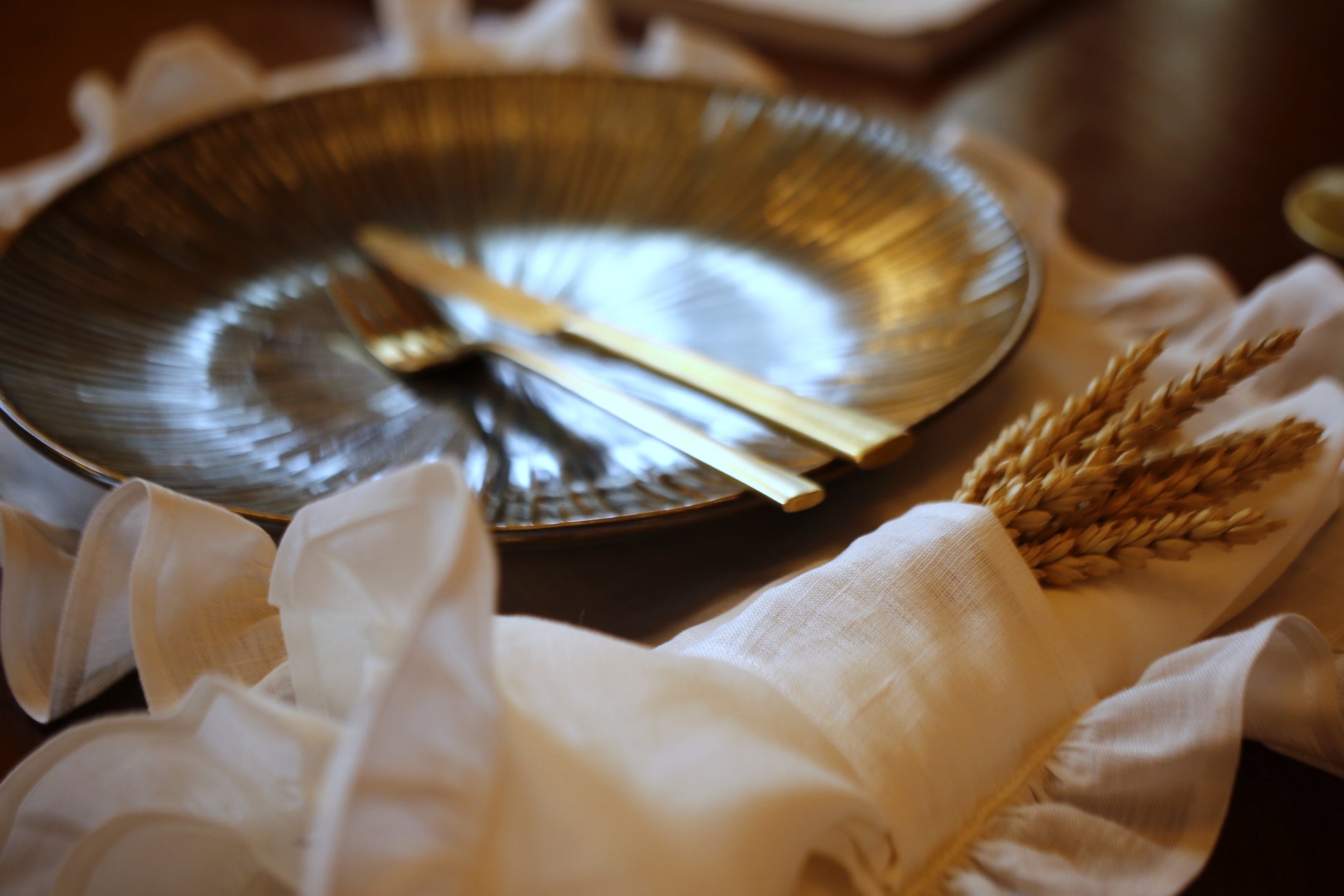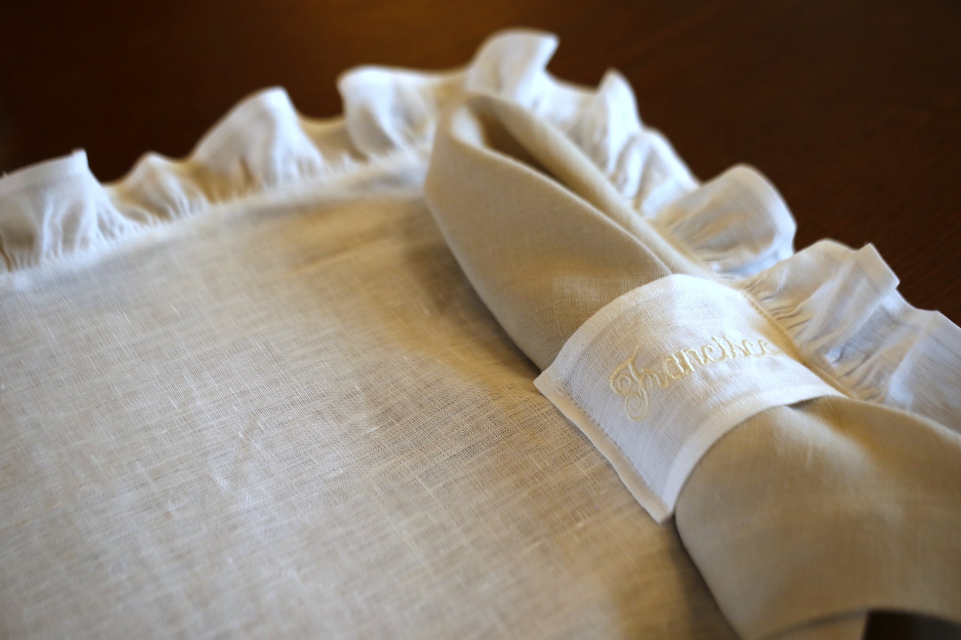 Um detalhe que faz a diferença: individual em linho certificado com argola e opção de personalização (nome ou inicial) — também disponível sem personalização.