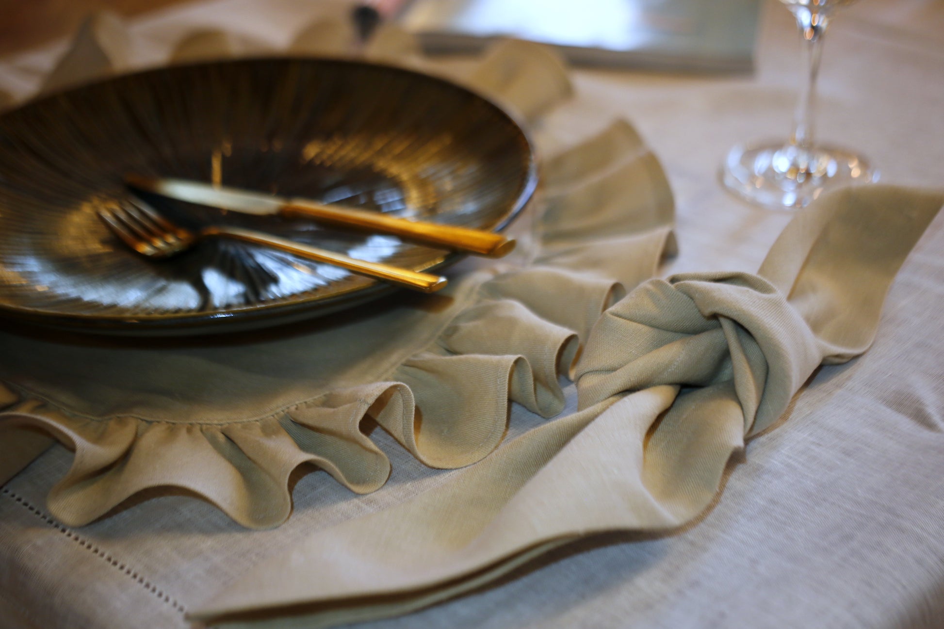 Crie composições cheias de charme com o individual redondo em linho certificado e folho envolvente — perfeito para misturar cores e estilos.